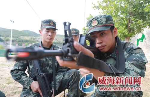 7月29日下午,在武警威海支隊的訓練場上,黝黑的面龐棱角堅韌,汗水順著帽沿一滴滴流下,武警威海支隊機動中隊四級警士長馬超正在指導新兵訓練,表情格外嚴肅。