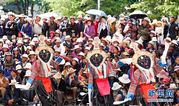 演員在西藏拉薩市宗角祿康公園內(nèi)表演藏戲(6月1日攝)。 新華社記者 普布扎西 攝