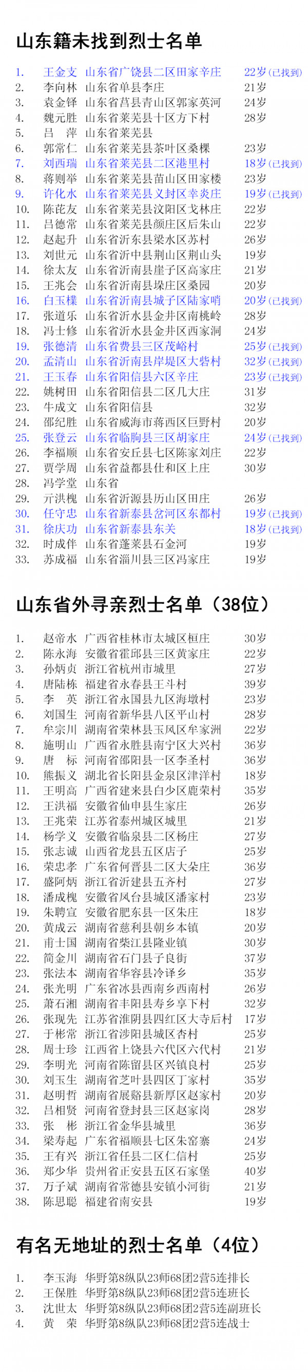 ????記者統計發現,倡議發出6天來,在山東籍未找到的33名烈士名單中,已有任守忠(活烈士)、徐慶功(實為徐勤功)、姚樹田(實為姚吉田)、王玉春、張登云、許化水(活烈士)、白玉檏、張德清、王金支、劉西瑞10名烈士找到家鄉和親人。另外,還找到時成伴、張道樂、劉世元、馮士修等山東籍烈士的親屬線索信息。