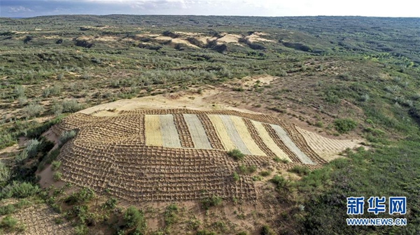 ????寧夏鹽池縣沙泉灣荒漠化綜合治理示范項目區內,連片的沙丘已經消失,只剩下一片留作實驗觀察的沙地(2019年7月17日無人機拍攝)。 新華社記者 馮開華 攝