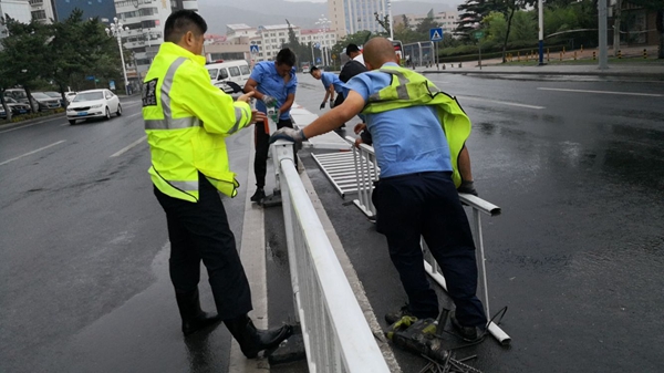 ????為方便工作人員搶修,交警一大隊民警趕到現場疏導交通,工作人員則抓緊時間將護欄扶起,同時上緊護欄與地面間的螺絲,以防其再次倒伏。因為處理及時,周邊交通沒有受到影響。