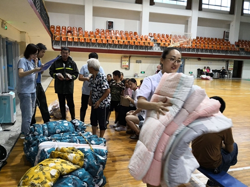 田和街道工作人員為安置點群眾發放被褥等物資。 通訊員 于曉玲 攝