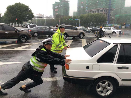 “師傅,怎么了?”“車子怎么打都打不著火!”風雨中,司機的話透著著急。聽罷司機講述,于肖飛二話沒說,與搭檔徑直走到轎車尾部,“師傅別急,我們來幫忙推一把!”