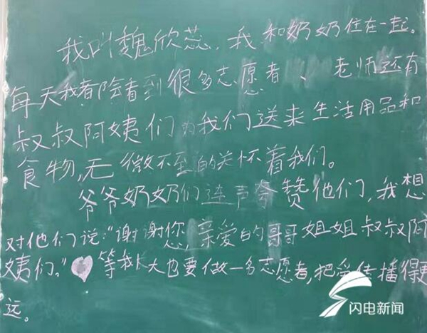 ????“我叫魏欣蕊,我和奶奶住在一起。每天我都會(huì)看到很多志愿者、老師,還有叔叔阿姨們?yōu)槲覀兯蛠?lái)生活用品和食物,無(wú)微不至地關(guān)懷著我們。爺爺奶奶們連聲夸贊他們,我想對(duì)他們說(shuō):‘謝謝您,親愛(ài)的哥哥姐姐、叔叔阿姨們。等我長(zhǎng)大也要做一名志愿者,把愛(ài)傳播得更遠(yuǎn)’。”