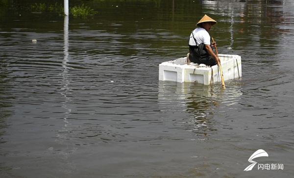 (淄博一居民通過自制皮劃艇過“馬路”)