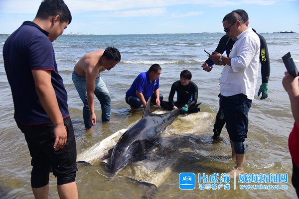 ????當天上午,在石島灣石島濱海公園附近海域的淺水區,這只海豚背鰭不時露出水面,始終在觀望的人群附近轉圈。“這海豚好像受傷了,看起來像是在向人群求救。”環衛工閆女士告訴記者,當時很多人都打電話報警。