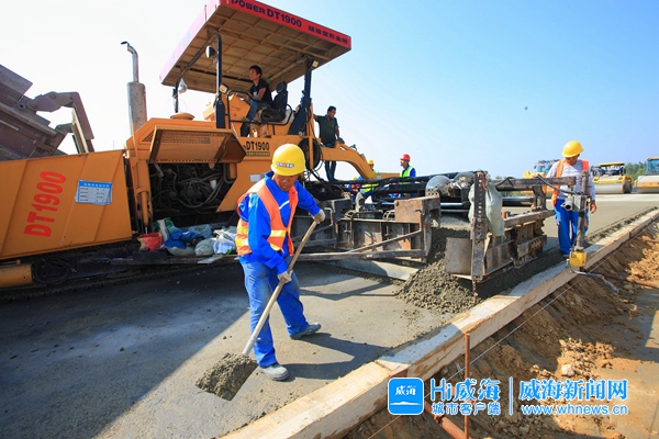 10月3日,在文萊高速乳山段的工地上,工人們正在鋪設路面。 記者 朱春曉 攝