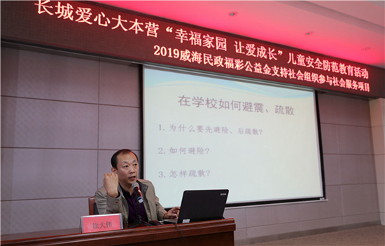 ??????現場,威海市地震監測中心運維保障科副科長徐大偉為學生們帶來一場生動的科普講座,從避震、疏散等方面詳細介紹了地震來臨時的自救常識。當天還進行了地震應急疏散演練活動。