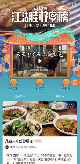 ????“江湖封神榜”一改單一平臺“流量式”評價體系,按神口味、神技藝、神體驗三個維度為用戶尋找好店。