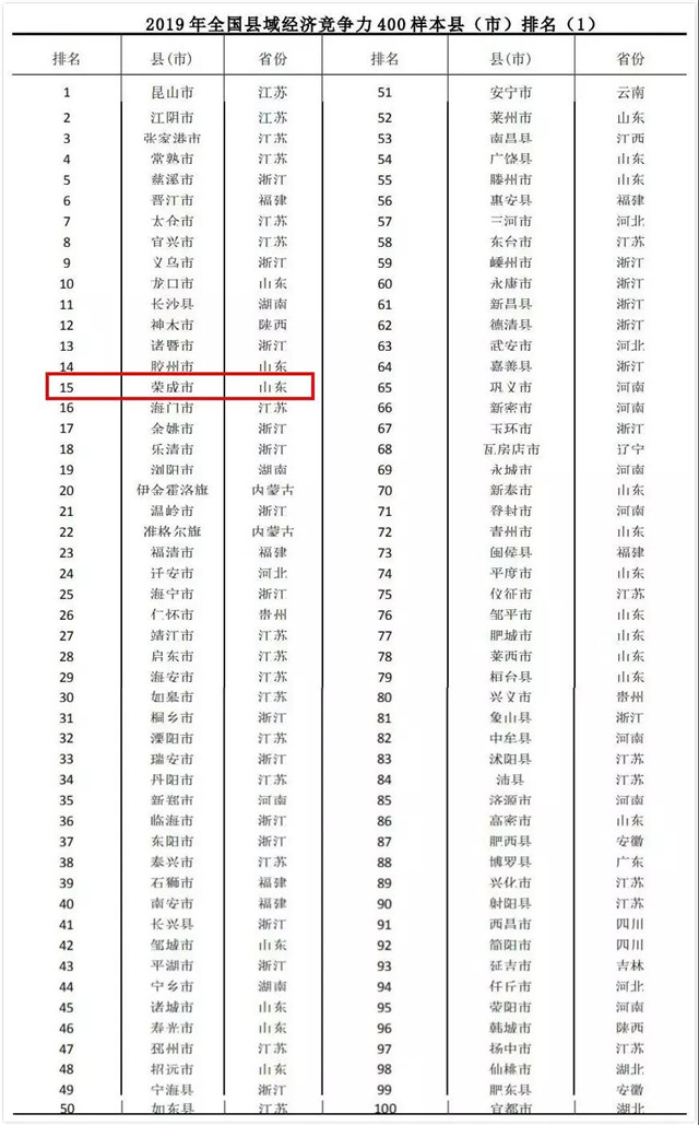 在2019年全國綜合經濟競爭力百強縣(市)榜單中,威海榮成市排名全國第15!