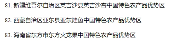 ????記者從農業農村部了解到,為貫徹落實中央1號文件和《政府工作報告》精神,農業農村部、國家林業和草原局等九部門開展了中國特色農產品優勢區創建和遴選工作。經縣市(墾區、林區)申請、省級推薦、專家評審等程序,日前將遴選出的中國特色農產品優勢區(第三批)進行公示。
