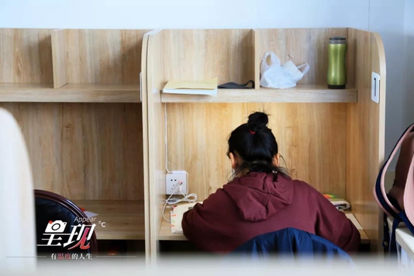 ????自習室為學生提供熱水、茶包和WIFI服務,每一個座位都打造成了“格子間”,小小的空間配置了插座、臺燈、臨時儲物柜,功能齊備。