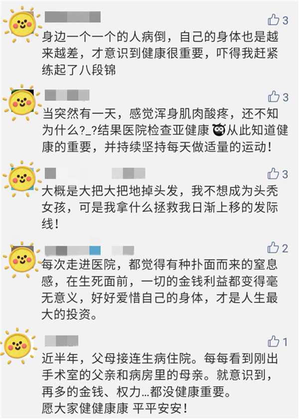 也有人給侃侃留言說,驚聞相隔一天曾見過面的朋友突然離世時(shí),才意識(shí)到健康很重要。
