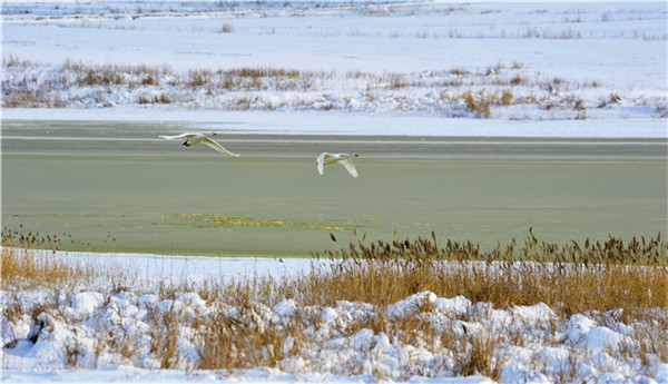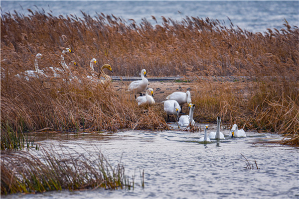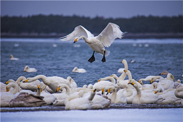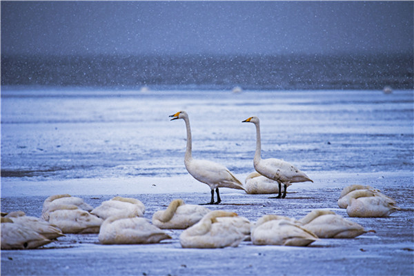 在如此漫長的遷徙中,它們要在高山雪嶺中抵御嚴(yán)寒,在風(fēng)雷雨電中奮勇飛翔,在冰天雪地中尋找食物,在蒼茫的天際中確定航向……這是怎樣堅韌的毅力和信念,才能讓這群“凌波仙子”不畏艱辛數(shù)月飛行。而又是什么樣的天賜福地,讓大天鵝千里跋涉只為來此越冬?