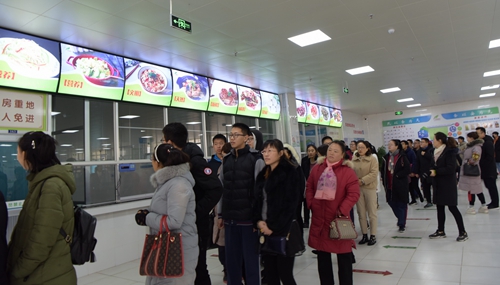 食堂負責人陪同家長學生參觀餐廳。興順餐飲公司駐校以來,以服務師生為宗旨,創(chuàng)建“五心”食堂,就餐環(huán)境改善,飯菜花樣增多,飯菜質(zhì)量提高,情系師生、真誠服務,為師生健康保駕護航!