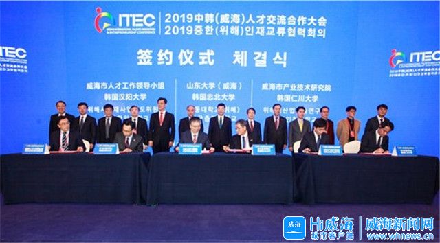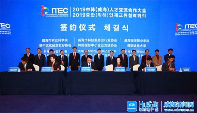 ????本次大會由威海市人才工作領導小組主辦,中共威海市委組織部、山東大學(威海)、威海高新區管委會、威海人才協會承辦。大會以“創新共享·合作共贏”為主題,邀請韓國高校、研發機構、科技企業、人才團體負責人,在韓中國博士研究生代表,山東大學(威海)、哈爾濱工業大學(威海)等駐威高校負責人,以及威海市產業園區、科研院所、重點企業負責人共220余名嘉賓參會交流對接,威海市6家單位與韓國6家機構就深化人才交流簽署合作協議。