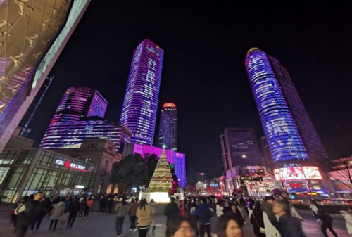 12月31日晚,“品牌之光耀未來”燈光秀在南京新街口精彩亮相。