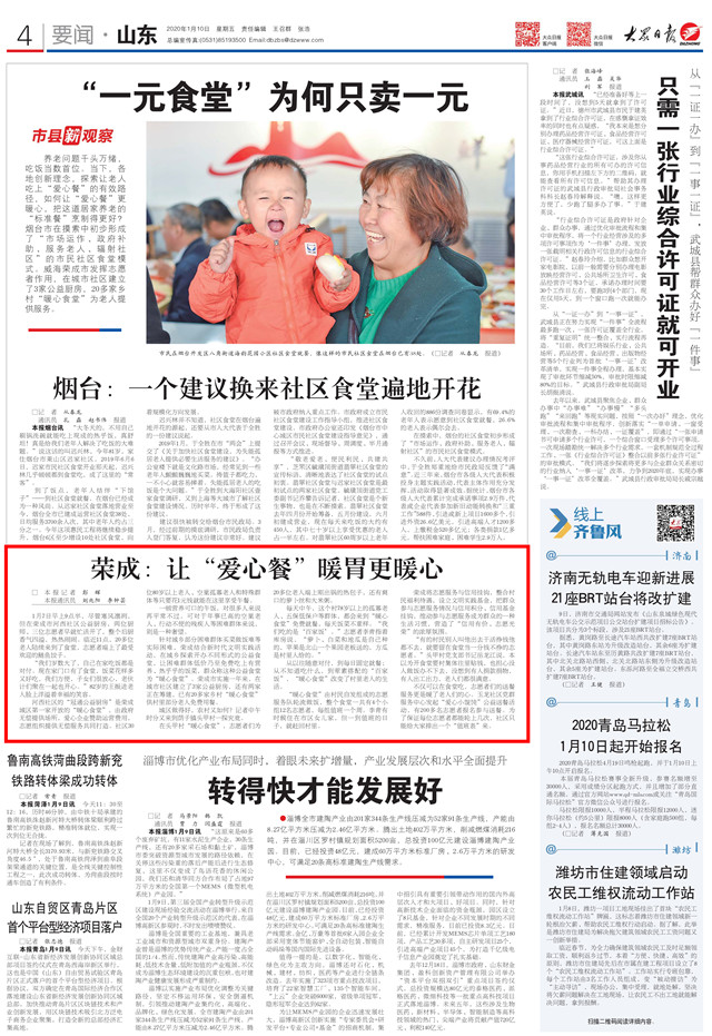 ????1月10日,《大眾日報》四版刊發(fā)題為《榮成:讓“愛心餐”暖胃更暖心》的文章,聚焦威海榮成“暖心食堂”建設(shè)。