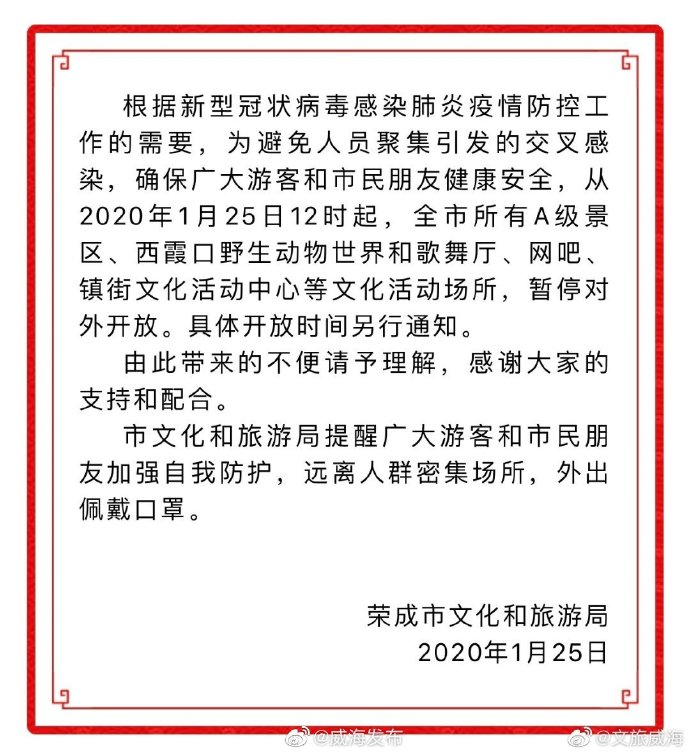 ????自2020年1月25日12時起,全市所有A級景區、西霞口野生動物世界和歌舞廳、網吧、鎮街文化活動中心等文化活動場所,暫停對外開放,具體開放時間另行通知。