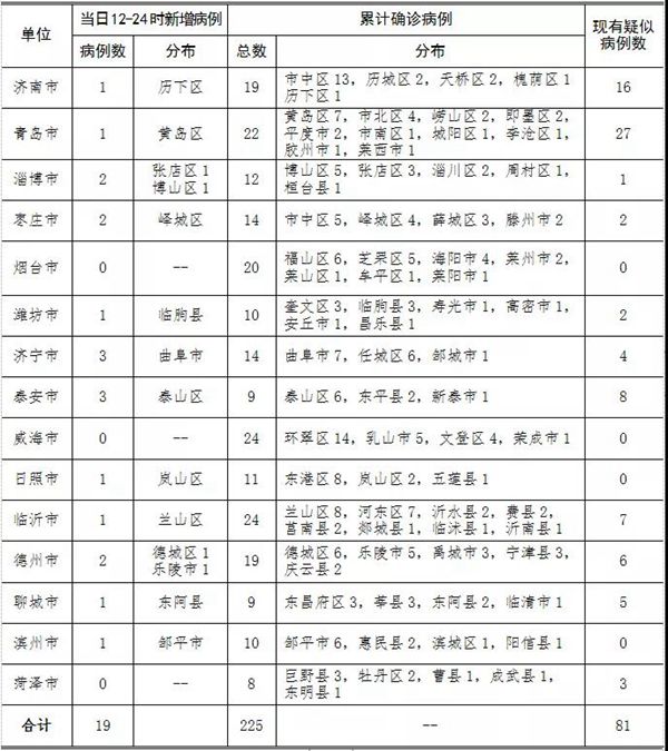 ??????2020年2月1日12—24時(shí),山東省報(bào)告新型冠狀病毒感染的肺炎新增確診病例19例,累計(jì)確診病例225例(含重癥病例15例,危重癥病例1例,出院5例,無死亡病例);新增疑似病例33例,現(xiàn)有疑似病例81例。截至目前,追蹤到密切接觸者7277人,已解除醫(yī)學(xué)觀察997人,診斷為疑似或確診86例,尚有6194人正在接受醫(yī)學(xué)觀察。