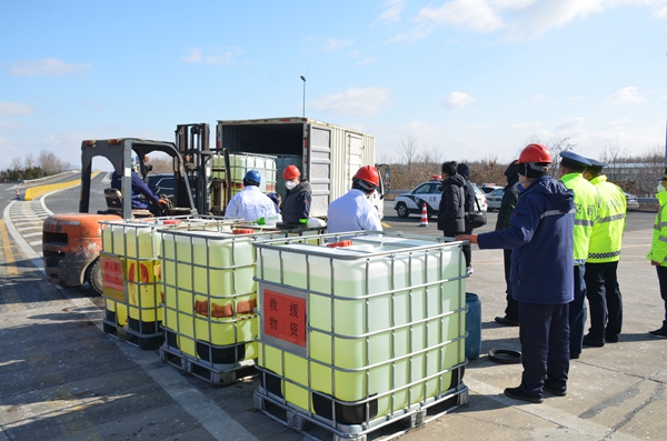 ??????情況特殊,如果放行,那么將很有可能將病毒放了進來,怎么辦?值守人員馬上報告,疫情應急處置小組緊急研究決定:小桶分裝,把消毒液從企業(yè)運送到服務區(qū)裝車。由于任務急迫,這輛車一個桶也沒帶,而短時間內(nèi)又難以調(diào)集到足夠的小型分裝桶。執(zhí)行第二套方案:車輛開至高速文登北出口,消毒液大桶分裝,用叉車裝車。而這么做,先裝上車的大桶沒法挪動,叉車上不了廂式貨車,這可把人們急壞了。
