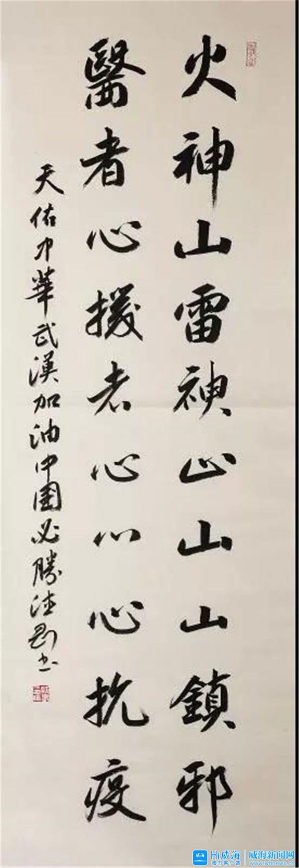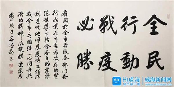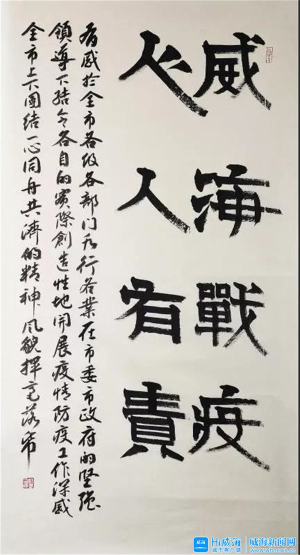 2月6日上午,經區書法家協會主席、藝文齋美術館館長江德剛(右)趕到威海日報和威海晚報編輯部,向連日奮戰在抗擊疫情報道一線的采編人員贈送書法作品。有感于全市各級各部門、各行各業在市委、市政府的堅強領導下,團結一心防控疫情,他深感振奮,揮毫潑墨,祝福威海人民早日打贏疫情防控阻擊戰。(Hi威海客戶端記者 宮舉衛)