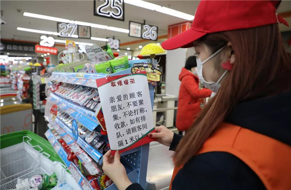 超市的小喇叭廣播里不斷播放“快進快出、少次多買、買完立走、不要逗留、錯峰購物、不要帶孩子來超市”等提示語言。在收款區及商品擺放區,隨處可見寫有諸如 “請隨買隨走不要逗留”“如有排隊,請顧客間隔1米以上”等提示貼。