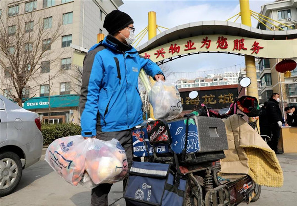 市民王紅通過“悅生活”小程序下單購買調味品、蔬菜和肉類后,工作人員很快便為她送貨上門。“在一線的工作人員幸苦了。”王紅連連表示。