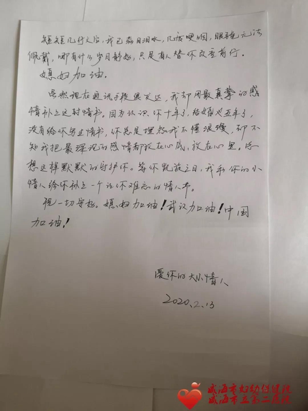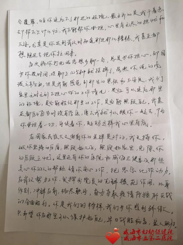 ??????在國家民族大義面前你的選擇是對的,我支持你,做你堅強的后盾,照顧好兒子,照顧好家里,免除后顧之憂。這里還有你的醫院、威海衛健委和那些關心你的人的幫助,請安心工作,把思念化作動力,在武漢能努力工作,發揮出黨員的先鋒模范作用,以身作則,沖鋒在前,恪盡職守,奮力奪取疫情防控殲滅戰的全面勝利。你是我們的榜樣,我們為你感到驕傲。只希望你在那里可以保護好自己,早日戰勝病毒,家人盼歸。