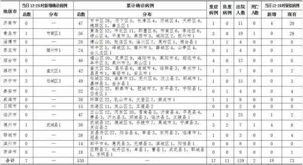 ????2020年2月14日12-24時,山東省報告新增新型冠狀病毒肺炎確診病例7例,累計確診病例530例(含重癥病例17例,危重癥病例11例,治愈出院139例,死亡病例2例);新增疑似病例18例,現(xiàn)有疑似病例73例。截至目前,追蹤到密切接觸者15074人,已解除醫(yī)學觀察11324人,診斷為疑似或確診病例264例,尚有3486人正在接受醫(yī)學觀察。