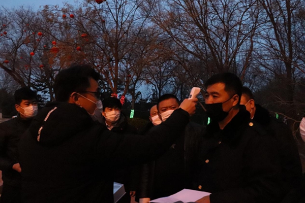 應急保障組工作人員教駕駛員使用測溫槍