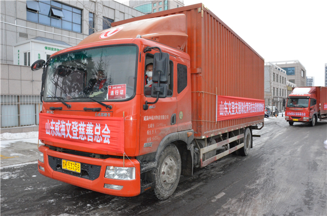 ??????2月17日上午,由1輛商務車和2輛貨車組成的支援湖北省黃岡市的防疫捐贈物資運送車隊從威海市文登區啟程,車隊將歷時20多個小時,跨越1400多公里,將物資送達黃岡市團風縣。
