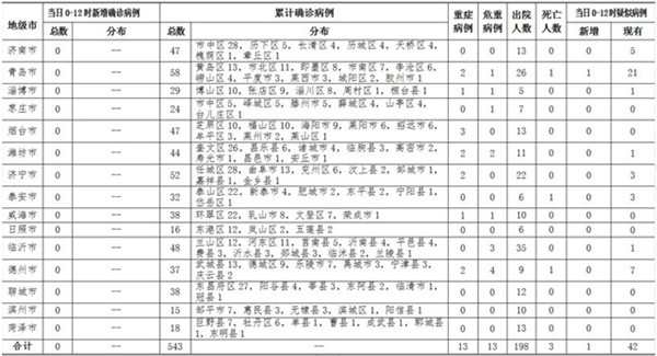 2020年2月18日0-12時(shí),山東省無新增新型冠狀病毒肺炎確診病例,累計(jì)確診病例543例(含重癥病例13例,危重癥病例13例,治愈出院198例,泰安市新報(bào)告死亡病例1例);新增疑似病例1例,現(xiàn)有疑似病例42例。截至目前,追蹤到密切接觸者16021人,已解除醫(yī)學(xué)觀察12852人,診斷為疑似或確診病例289例,尚有2880人正在接受醫(yī)學(xué)觀察。