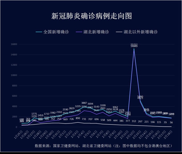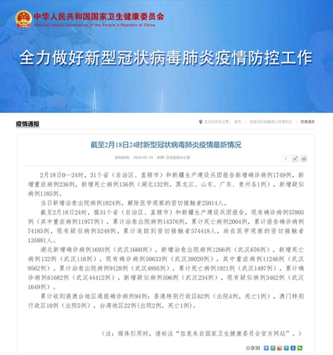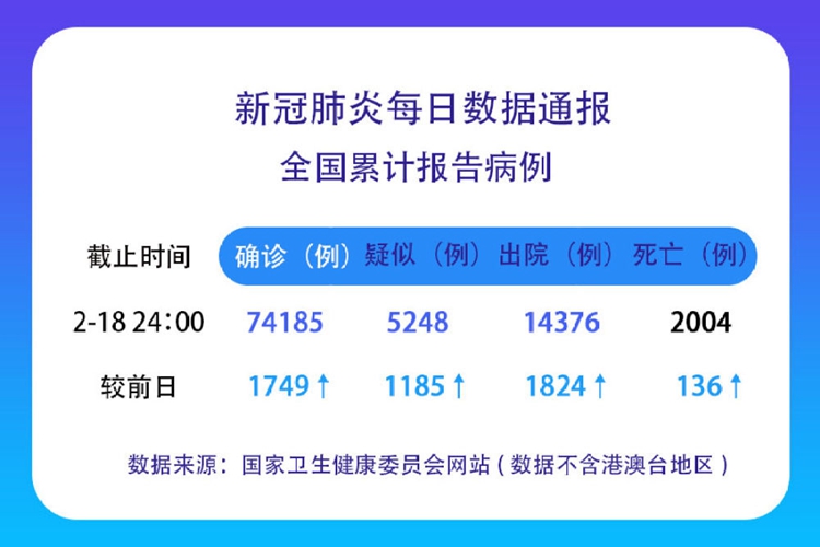 ??????截至2月18日24時(shí),據(jù)31個(gè)省(自治區(qū)、直轄市)和新疆生產(chǎn)建設(shè)兵團(tuán)報(bào)告,現(xiàn)有確診病例57805例(其中重癥病例11977例),累計(jì)治愈出院病例14376例,累計(jì)死亡病例2004例,累計(jì)報(bào)告確診病例74185例,現(xiàn)有疑似病例5248例。累計(jì)追蹤到密切接觸者574418人,尚在醫(yī)學(xué)觀察的密切接觸者135881人。