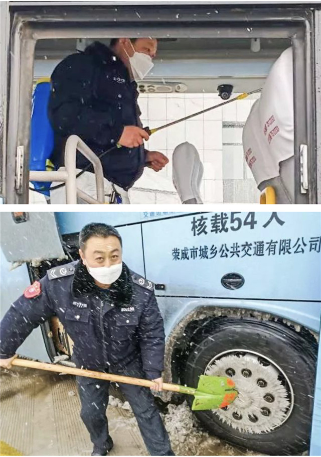 ??????2月14日早上5:10分,正值漫天風雪,榮成公交集團6名駕駛員佩戴口罩、手套、護目鏡,在完成體溫檢測和車輛消毒后,準時從榮成出發。出發前,啟動了應急預案,嚴格做好車輛消毒和雪天駕駛安全防護工作。