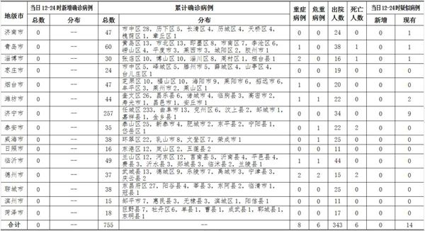 ??????2020年2月24日12-24時,山東省無新增新型冠狀病毒肺炎確診病例,累計確診病例755例(含重癥病例8例,危重癥病例6例,治愈出院343例,死亡病例6例);無新增疑似病例,現(xiàn)有疑似病例14例。截至目前,追蹤到密切接觸者16706人,已解除醫(yī)學觀察15047人,診斷為疑似或確診病例291例,尚有1368人正在接受醫(yī)學觀察。