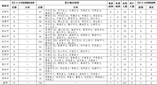 ??????2020年2月25日12-24時,山東省無新增新型冠狀病毒肺炎確診病例,累計確診病例756例(含重癥病例7例,危重癥病例7例,治愈出院357例,死亡病例6例);新增疑似病例1例,現有疑似病例4例。截至目前,追蹤到密切接觸者16744人,已解除醫(yī)學觀察15206人,診斷為疑似或確診病例291例,尚有1247人正在接受醫(yī)學觀察。