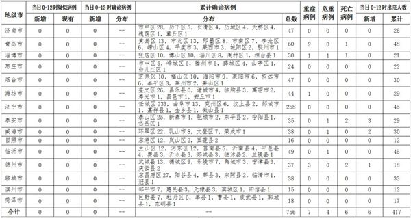 ??????2020年2月29日0-12時,山東省無新冠肺炎疑似病例;無新增確診病例,累計確診病例756例(其中,重癥病例7例,危重癥病例4例,死亡病例6例);新增治愈出院6例,累計治愈出院417例。截至目前,追蹤到密切接觸者16851人,已解除醫學觀察15755人,診斷為疑似或確診病例291例,尚有805人正在接受醫學觀察。