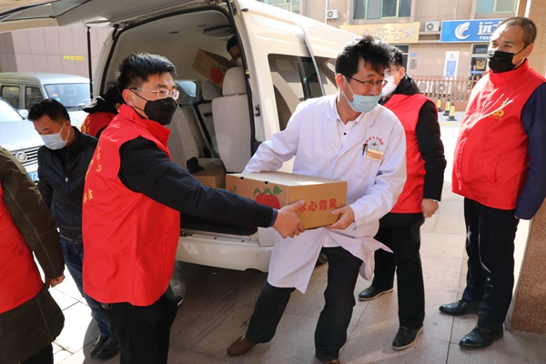 ??????3月4日,榮成農商銀行志愿服務隊組織黨員、團員青年志愿者到榮成市中醫院慰問一線醫護人員,為他們送去20箱蘋果,祝愿他們戰“疫”得勝,平安凱旋。