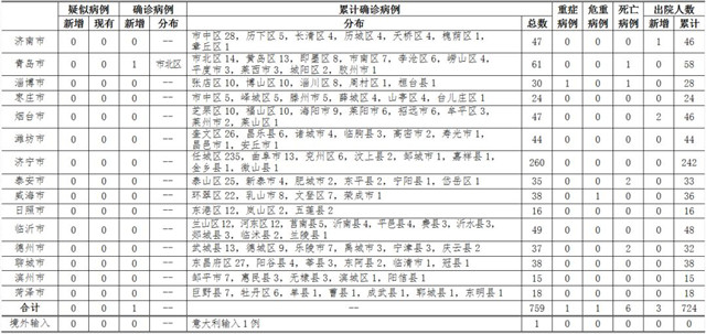 ??????2020年3月11日0-12時,山東省本地新增確診病例1例,無新增疑似病例,累計報告確診病例759例(其中,重癥病例1例,危重癥病例1例,累計死亡病例6例);新增治愈出院3例,累計治愈出院724例。目前共追蹤到密切接觸者17090人,尚有129人正在接受醫學觀察。