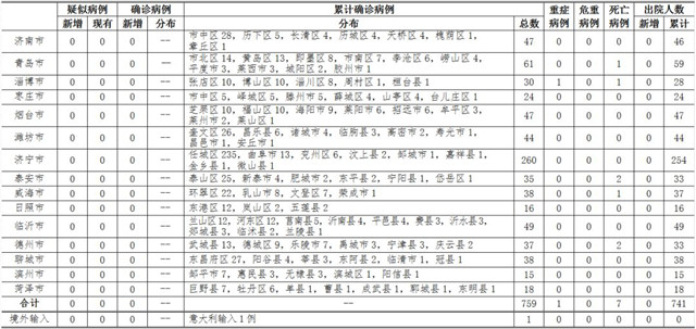 2020年3月14日12-24時,山東省本地無新增確診病例,無新增疑似病例,累計報告確診病例759例(其中,重癥病例1例,累計死亡病例7例);無新增治愈出院病例,累計治愈出院741例。