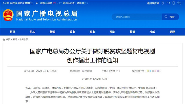 ??????根據《國家廣電總局辦公廳關于做好脫貧攻堅題材電視劇創作播出工作的通知》要求,脫貧攻堅重點劇目在各級電視臺特別黃金時段優先排播,各級電視臺拿出重點頻道和時段,做好重點劇目播出和宣傳,省級衛視黃金時段優先排播重點劇目,重點劇目播出時統一在劇名畫面中加“國家廣播電視總局脫貧攻堅重點劇目”標識。