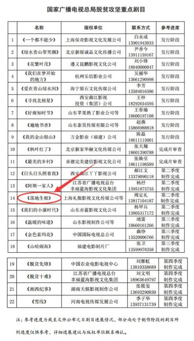 ??????3月17日,國家廣播電視總局公布了22部脫貧攻堅題材重點電視劇劇目名單,由南海新區管委、山東衛視傳媒、上海禮傲影視文化傳媒、涅磐文化傳媒(上海)、山東屹能市政工程聯合出品的電視劇《落地生根》名列其中。