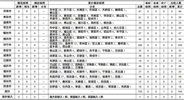 2020年3月21日0-12時,山東省本地無新增確診病例,無新增疑似病例,累計報告確診病例759例。無重癥病例、危重癥病例;累計死亡病例7例;無新增治愈出院病例,累計治愈出院749例。