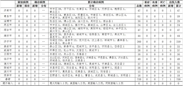 ??????2020年3月21日12-24時,山東省本地無新增確診病例,無新增疑似病例,累計報告確診病例759例。無重癥病例、危重癥病例;累計死亡病例7例;新增治愈出院病例1例,累計治愈出院750例。