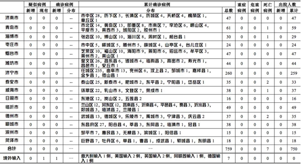 ??????3月22日0-12時,山東省本地無新增確診病例,無新增疑似病例,累計報告確診病例759例。無重癥病例、危重癥病例;累計死亡病例7例;無新增治愈出院病例,累計治愈出院750例。