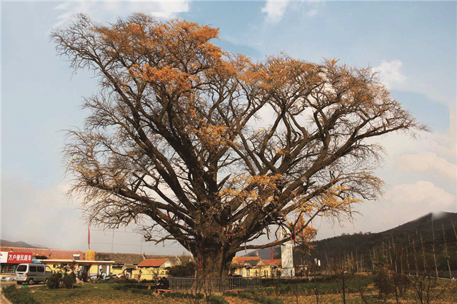 ??????萬家國槐 生長于乳山市馮家鎮萬家村,樹齡1200余年。據傳唐朝中和年間,黃巢起義軍曾在該國槐樹下拴過馬。樹東北有座山,當地農民叫“黃到頂”,電影《苦菜花》《山菊花》、電視劇《血染的土地》等均在此樹下拍攝。