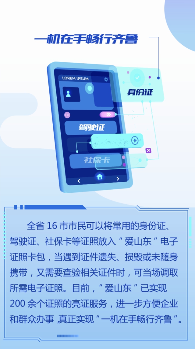 ????來來來!身份證、駕駛證、社保卡、健康、營業(yè)執(zhí)照……“愛山東”app已集合電子證照200余類!歡迎來試用!醫(yī)師證、護士證,景區(qū)全免費,假期出門忘了帶,也馬上用得上喲!