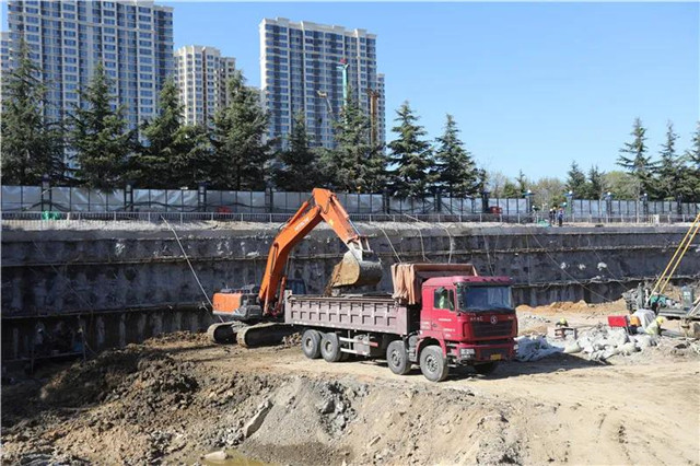 ??????近日,在經區世紀體育公園地下停車場施工區,一臺臺挖掘機掘起土方,倒進一輛輛排隊等候的自卸車車斗里,裝滿土方的自卸車轟鳴著駛過緩坡,爬上高差達10多米的地面,從西南側安裝淺水坑的出口駛出……