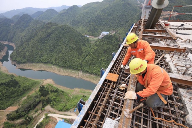 ????近日,由中鐵廣州局承建的貴州遵余高速湘江大橋工程在做好疫情防控的同時,全力恢復生產建設。 新華社記者 劉續 攝